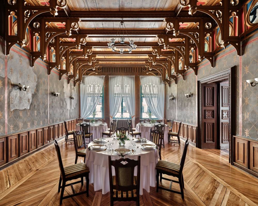 Największa sala w Pałacu to Sala Rycerska. To przepiękna sala zachowana w neogotyckim wystroju, oświetlona trzema oknami z drewnianą stolarką,